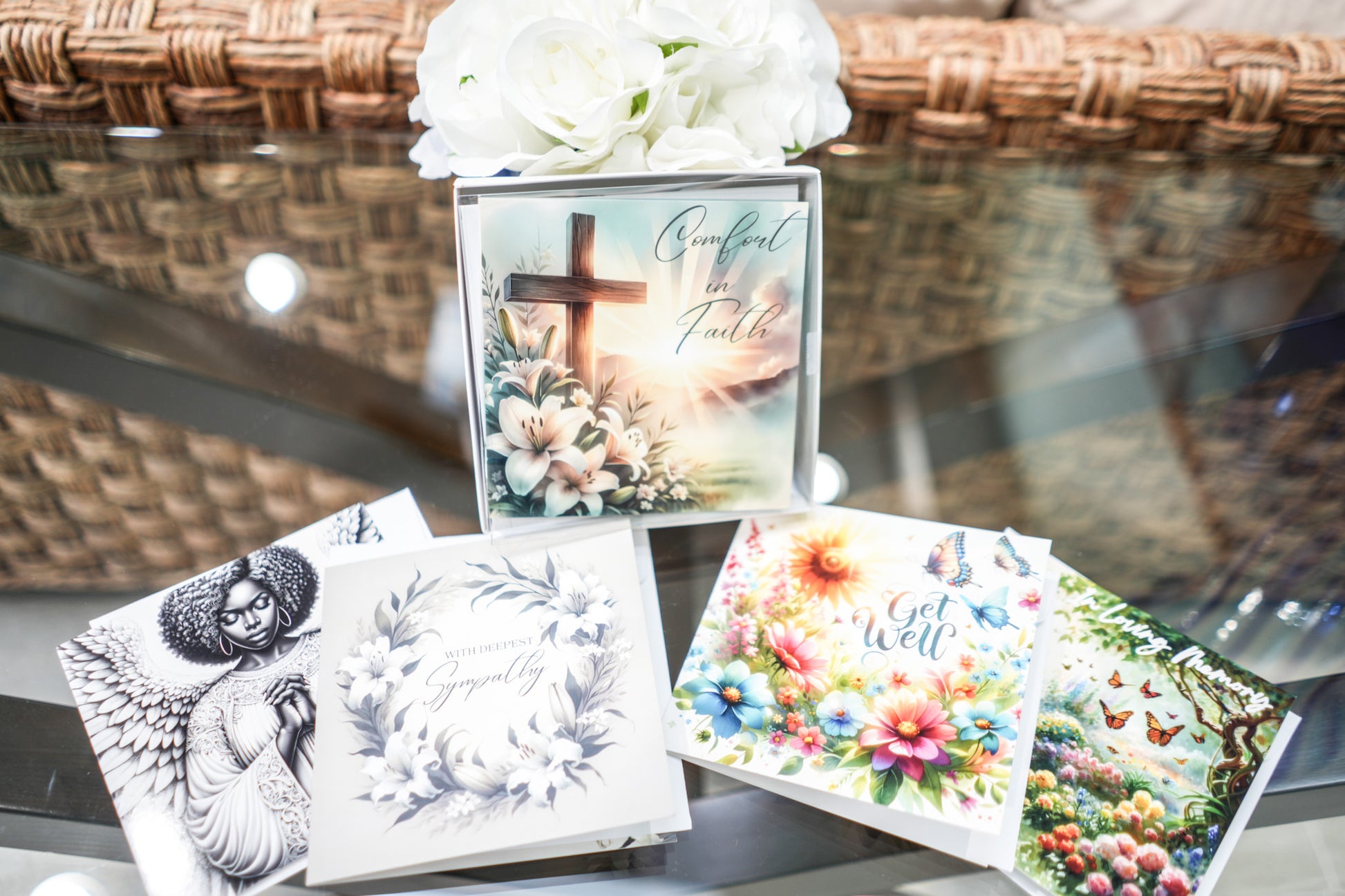 Set of 3 sympathy, 1 get well, and 1 thinking of you cards in a convenient box set. Send your condolences, well wishes, and thoughts to loved ones with these beautifully designed cards. The perfect way to show you care.